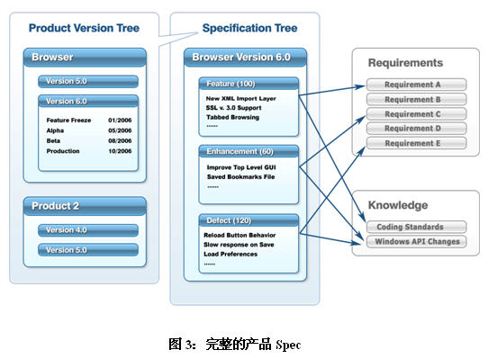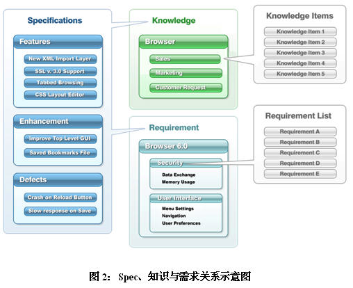 通常情况下,Spec包含功能、缺陷和功能增强三个部分,他们都来源于相关的知识或需求,并与需求条目和知识库中的知识条目相关联。图2以Browser 6.0产品为例,用图形化的方式显示了Spec与知识、需求的关系。针对Browser产品的最新版本6.0,有安全和用户界面两大类需求,通过需求分析师将其分解为新的功能,如支持SSL v.3.0、Tabbed Browsing等;除新功能以外,Spec还包括对之前版本的功能增强,如保存已标记的文件;以及上一版本的缺陷,如保存时响应缓慢。这些Spec通过规划、编码、测试等工作,构成最终交付的产品。