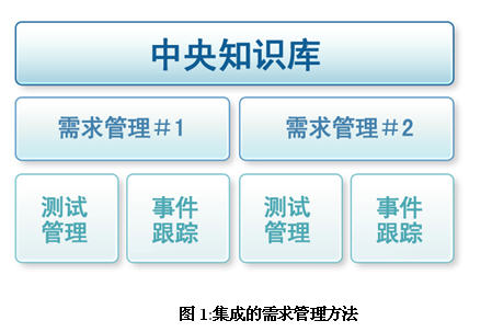 在独立实现以上功能的基础上,需求管理工具还需与ALM中的开发过程进行无缝集成,其中包含事件跟踪、测试管理、以及中央知识库(如图1所示)。