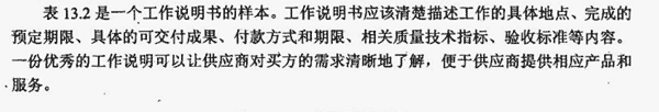 方确定他们是否有能力提供这些产品、服务或成果。至于应该详细到何种程度,会因采购品的性质、买方的需要或拟用旳合同形式而异。工作说明书中可包括规格、数量、质量、性能参数、履约期限、工作地点和其他需求。