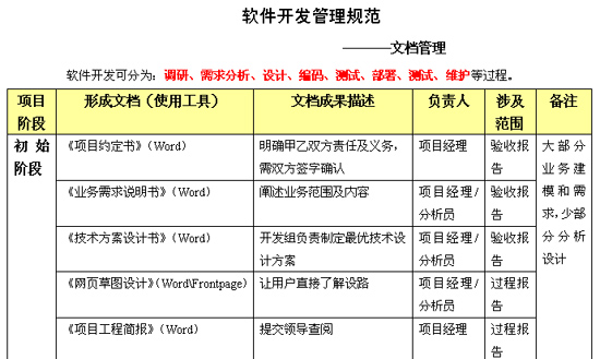 摘项目管理的根本目的是按时、保质、保量完成预期交付的成果。项目管理要让整个组织能清楚理解项目实施的目的、影响、进度,应做到项目组所有员工都应理解项目实施的原因、意义及客户的要求。在项目管理中还能看到公司高层领导通过实际行动表现出来的对于项目实施的支持与帮助,通过以制度化管理来组织合理安排员工的工作职责和角色转换。为满足上述要求,就必须让员工、企业、客户能接受并适应新的“软件项目开发管理规范”。