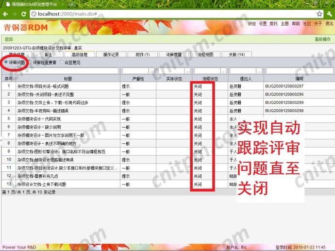 上述改进计划虽然不错,但无法实现自动跟踪,需要由QA人工跟踪,还是一种比较浪费资源的做法,借助青铜器RDM,可以实现自动将评审发现的问题转化为问题单据,而问题单据是可以通过系统自动管理和跟踪的,从而最大程度解决评审问题跟踪的资源投入,如下图: