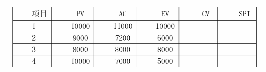 下表为同时开展的4个项目在某个时刻的计划值PV、实际成本AC和挣值EV,该时刻成本超出最多的项目和进度最为落后的项目分别是( )。