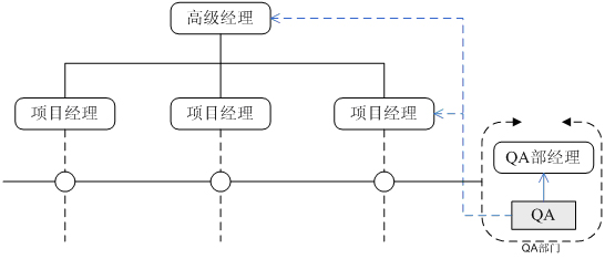 在矩阵结构中,设立了专门的 QA 部门,与各业务职能部门平级。 QA 隶属于 QA 部,行政上向 QA 经理负责,业务上向业务部门的高级经理和项目经理汇报。如图 2 所示。在这种组织结构中,由 QA 部经理对 QA 考评和授权,有利于保证 QA 的独立性和评价的客观性,也有利于确保组织的长期利益与项目(或个人)的短期利益之间的平衡。 QA 资源为所有项目所共享,可按照项目优先级动态调配,资源利用更充分,但也可能出现资源竞争冲突。此外, QA 部门对 QA 流程的改进、 QA 知识的管理、 QA 人员的发展负责,并可集中资源进行 QA 平台的建设,以防止重复性的投资。但另一方面,在矩阵结构中, QA 难于融入项目组,发现的问题也很少能得到及时有效的解决。