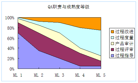 过程成熟度是影响 QA 职责分配很重要的因素,不同的成熟度等级所要求的 QA 工作分布是不同的,如图 4 所示。在低成熟度等级下,需要抽取各项目最佳实践来定义过程,并指导过程的试施, QA 在这方面的工作最多。随着过程的完善、制度化和实施, QA 的工作重点逐渐转向了过程评审和产品审计。当企业的过程成熟度达到 4 级或 5 级以后,对过程的遵守已经成为员工的一种习惯,过程和产品的审查需求减少,而度量和过程能力的优化又成为 QA 的工作重点。