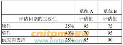 评估和选择最佳系统设计方案时,甲认为可以采用点值评估方法,即根据每一个价值因素的重要性,综合打分来选择最佳的方案。乙根据甲的提议,对如下表所示的系统A 和 B 进行评估,那么乙认为( ) 。