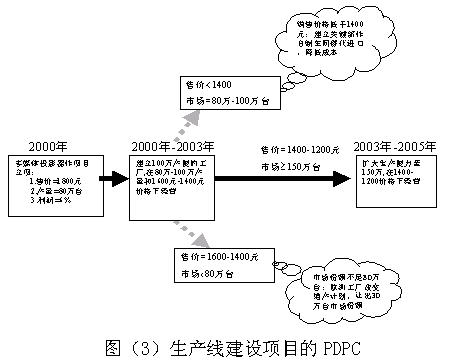 项目的另一个高风险因素是在2000年至2003年,中国的投影彩电市场销售数量可否达到80万台至100万台。由于企业对未来产品市场数量的预测只是未来市场销售数量的众多可能性之一,未来的市场销售数量也是项目的重要不确定因素。由于产品价格和销售数量将决定项目未来的销售收入,从而决定未来的工厂财务盈亏和经营状况。针对上述风险因素,项目决策小组建立了PDPC图。分别提出了不同的风险对策并标识在图上。决定未来的工厂财务盈亏和经营状况。针对上述风险因素,项目决策小组建立了PDPC图。分别提出了不同的风险对策并标识在图上,见图(3)。
