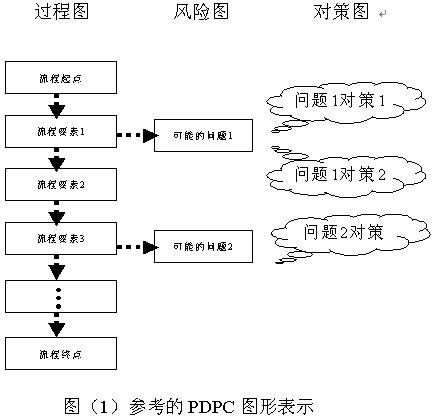 如果将上述步骤表示在图形中,PDPC技术表示方法见图(1)。图形由过程图、风险图和对策图三部分组成。在实践中PDPC技术的图形形式并没有严格的规定。可以是纵向的图形,也可以是横向的图形。你可以在网上看到多种不同的PDPC图形表示方法。