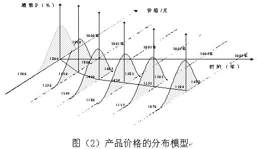 下面以一个投资项目的案例来说明PDPC技术在项目风险管理中的应用方法。2000年中国的投影彩电市场进入成长期,某跨国集团决定投资2亿元人民币,建设投影彩电的显示器件生产线。经济分析结论为年利润为5000万元,盈亏平衡点在80万台产品,项目的投资回收期为5年。项目的高风险因素是在投资后的3年(2000年-2003年)中产品价格可否维持在1600元-1400元之间,在其后的两年(2003年-2005年)可否维持在1400元-1200元。由于未来的不确定性和产品价格的分布特性,在2000年决定投资时不能做出确切的结论,见图(2)。
