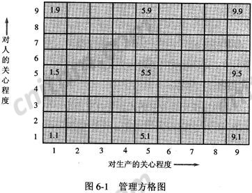 管理方格图(图6-1)中,1.1定向表示贫乏的管理,对生产和人的关心程度都很小;9.1定向表示任务管理,重点抓生产任务,不大注意人的因素;1.9定向表示所谓俱乐部式管理,重点在于关心人,企业充满轻松友好气氛,不大关心生产任务;5.5定向表示中间式或不上不下式管理,既不偏重于关心生产,也不偏重于关心人,完成任务不突出;9.9定向表示理想型管理,对生产和对人都很关心,能使组织的目标和个人的需求最理想、最有效地结合起来。