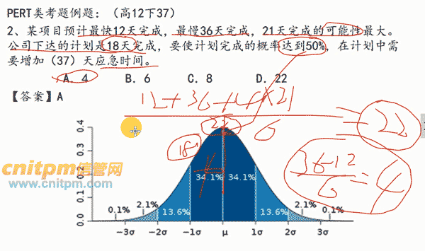 2、某项目预计最快12天完成,最慢36天完成,21天完成的可能性最大。公司下达的计划是18天完成,要使计划完成的概率达到50%,在计划中需要增加( )天应急时间。