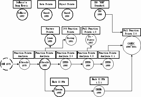 自从1979年第一个世界范围的功能点方法发表以来,许多针对原著变革、扩展的可供选择的方法被提出来。图2以时间顺序显示了包括那些在下面要详细描述的方法的演变重要阶段。方法之间的箭头表示各个扩展版本的相互影响。图中显示最近的方法是COSMIC全面功能点。既然早先的方法对这种方法存在大量影响,我们的研究会特别关注这种方法。