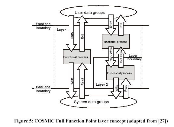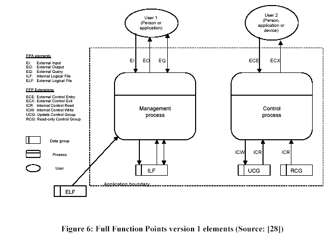 虽然版本1是IFPUG功能点的一个扩展(图6显示了它的基本模型)。版本2挖出、捕获了以前的方法的基本理念 [10] 。这个版本的开发是由COSMIC的来自8个大家40个专家完成的。