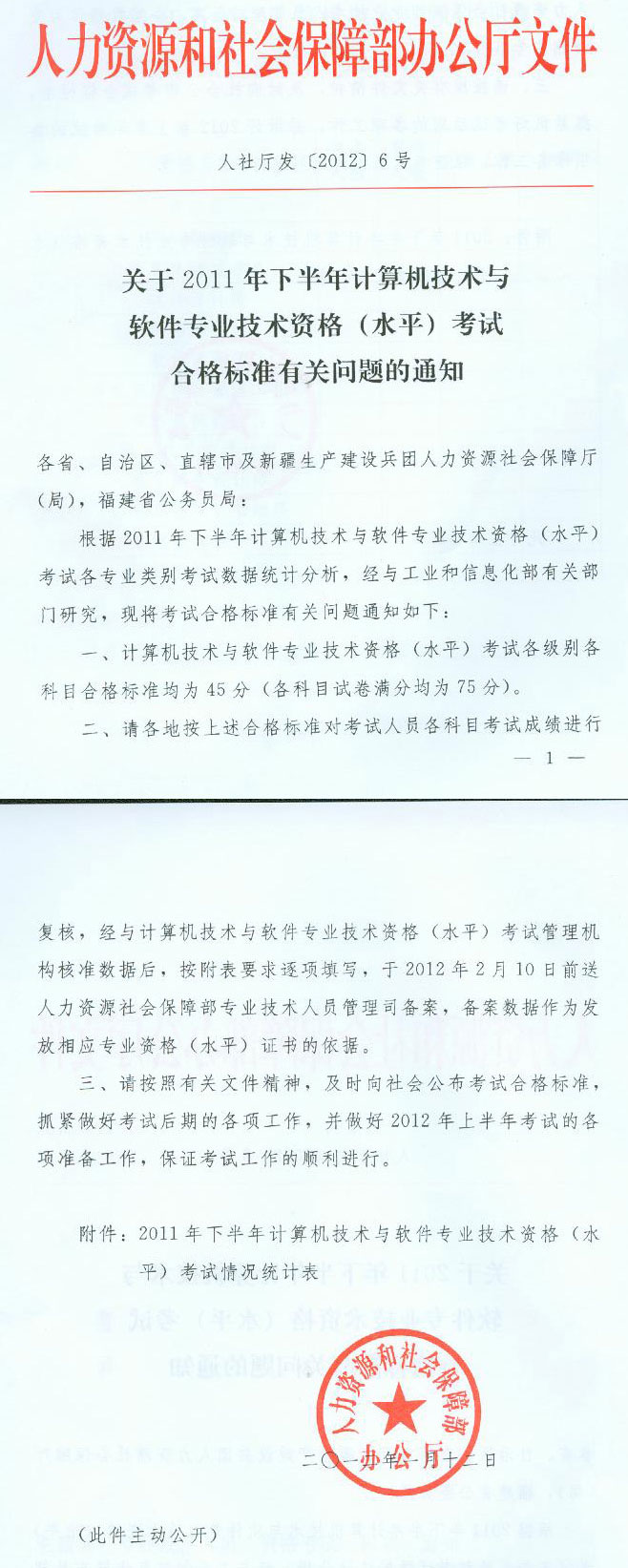 根据2011年下半年计算机技术与软件专业技术资格(水平)考试各专业类别考试数据统计分析,经与工业和信息化部有关部门研究,现将考试合格标准有关问题通知如下: