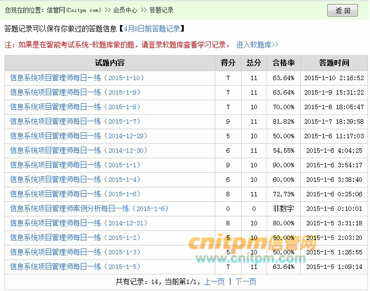 第一次考试:2013年评职称失败后,我想考试跟评职称两条路同时走,以便早日拿到高级职称,于是在2014年春节决定参加信息管理师的考试。以前在企业一起共事的同事中,有几位职位和技术跟我差不多的都考过了高项(即信管),因此我对自己的能力也有信心。其中一位过了pmp跟信管的同事是我们的考试大王,他跟我介绍说,考信管,对于案例和论文主要是结合自己的工作经验,胡诌就行了。我本身就有一定的项目管理知识,参与过很多项目的具体管理,于是就参照这位同事的经验,没有看太多的书,只是将项目管理的九大领域的各个过程背下来了,断断续续地看了柳纯录主编的信息系统项目管理师教程(第2版),都没看完。临考前一周做了一些真题。2014年5月,我第一次参加高项的考试,上午还挺顺利,提前50分钟我就交卷了。下午考试前跟身边一位考友聊天,他以过来人的口吻说,上午题目容易,下午题目可能就很难。果然下午的案例题大出我的意料,第2道是进度网络图+挣值计算,把我整蒙了,花了差不多一个小时来做,应该只对了一半左右;第3题考的是大项目,我完全没看过大项目的内容,只能按着项目管理的一般知识匆忙编了几句。考完就知道第二场肯定过不了,考试结果如我所料,案例只有二十多分,但是第一场和第三场的成绩还不错,给了我努力下一次通过的信心。