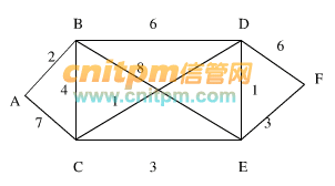已知有6个村子,相互之间道路的距离如图所示.拟合建一所小学,已知A除有小学生50人,B处40人,C处60人,D处20人,E处70人,F处90人,问小学应建在哪一个村子,是学生上学最方便(走的总路程最短) A、A村 B、B村 C、C村 D、D村