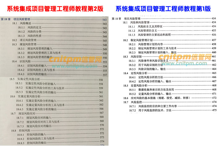 系统集成项目管理工程师第2版第18章与老版教材对比,章节修改不是很大,基本是以风险管理过程作为章节,只是过程名称上进行了修改,原先制定风险管理计划修改为规划风险管理;风险识别修改为识别风险;定性风险分析修改为实施定性风险分析;定量风险分析修改为实施定量风险分析;风险应对修改为规划风险应对;风险监控修改为控制风险,里面内容有一定修改。