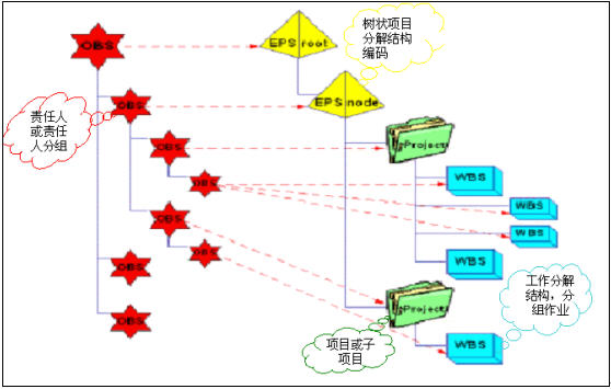OBS反映的是企业的管理层次与架构,通过OBS与EPS、Project、WBS、作业的对应实现严谨的责任分解体系,做到事事有人负责,无管理盲区。如下图所表示: