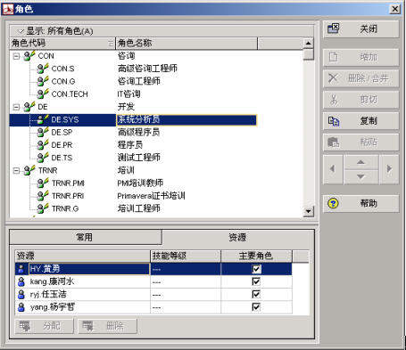 角色是对企业中某一类资源的总称。角色的作用包括:1)编制计划时,当不能确定给作业分配具体的资源时,暂时分配给作业相应的资源。2)计划编制阶段,当资源需求被批准后,可以依据角色来分配资源。3) 可以分析企业内某一角色的资源的需求与使用的汇总情况。比如开发人员可以细分为系统分析员、高级程序员、程序员、测试工程师。IT公司典型的角色分类如下图: