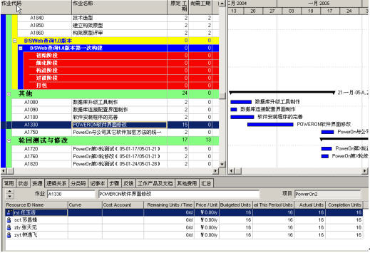 在P3E中,通过任务上的资源加载,指定完成任务的具体人员。当一个任务需要多人参与完成的时候,需要指定谁是“主要资源”,在P3E中,由主要资源反馈任务的进度,非主要资源反馈消耗的人工时。如下图:PowerOn软件界面修改美工和三位程序员协作完成。其中,主要资源是“钟易飞”。