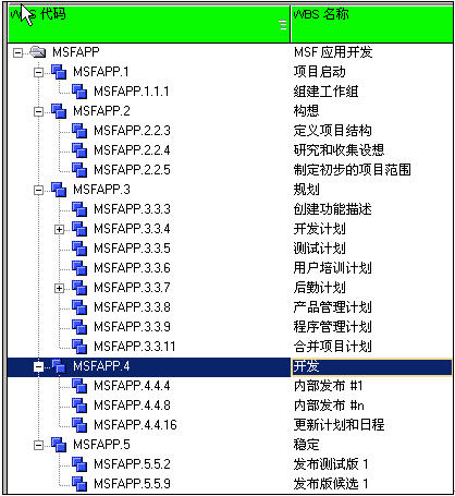 与工程建设项目不同的是,IT研发项目由于采用不同的开发方法体系,其WBS划分有明显的不同。据统计,各种开发方法体系有近20种,比如常见的瀑布模型法、螺旋法、V模型法、Crystal方法、Scrum方法、极限编程法、微软的MSF框架、IBM Rational的RUP方法等等。各种方法的优劣,本文不做评判,需要指出的是,为了走出软件开发的混沌泥潭,针对研发项目,必须依据企业实际确定项目的开发过程管理方法,有,总比没有好(现今还有一些IT企业的软件开发过程严格上讲还是没有办法可循)。很多开发方法体系都提供了计划模板,非常值得我们学习研究。下图是微软MSF的WBS框图。