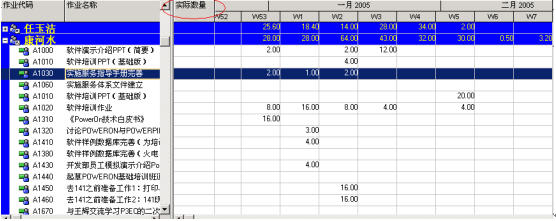 P3E提供了强大的资源分析视角,可以对资源的预算数量、实际数量、赢得值进行分析、统计、汇总。如下图显示的是“康河水”每周的工作负荷。可以作为企业人力资源考评的参考。