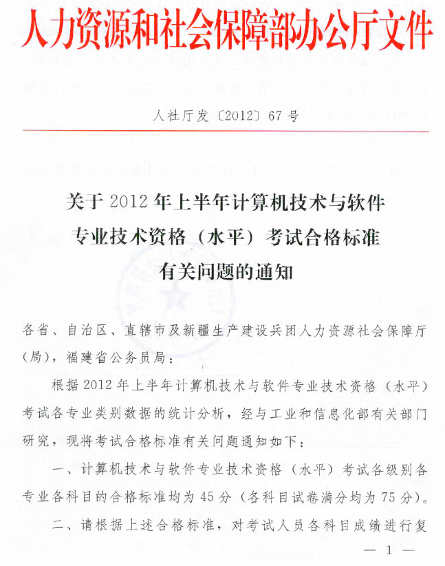 根据人力资源和社会保障部《关于2012年上半年计算机技术与软件专业技术资格(水平)考试合格标准有关问题的通知 》,今年软考各科合格分数为45分,以下为文件全文:
