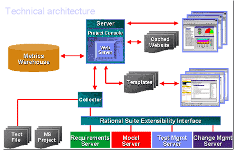 以上所介绍的业务功能:项目管理由MS Project、软件需求管理由IBM Rational RequisitePro、软件设计由IBM Rational Rose Data Modeler、软件变更管理由IBM Rational ClearQuest、软件版本控制由IBM Rational ClearCase、软件测试管理由IBM Rational TestManager分别完成的,对于项目管理者来说,应用起来有诸多不便,IBM提供的Rational ProjectConsole解决了以上问题,将这些软件有机地集合起来,极大地方便了用户。在Rational ProjectConsole里,将软件项目的管理分为:项目里程碑级和任务级两种管理。