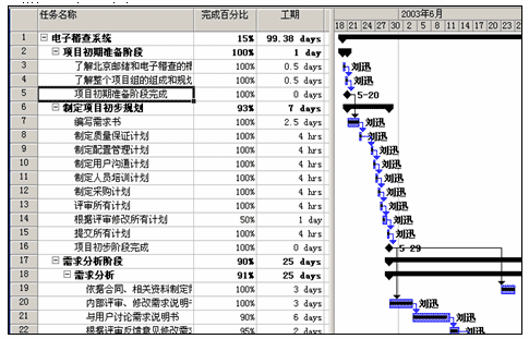 项目组成员可以在Project中对自己负责任务的完成情况进行设置,待设置被项目经理确认后,登录系统就可以查看项目各个任务的完成情况,如下图: