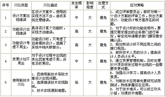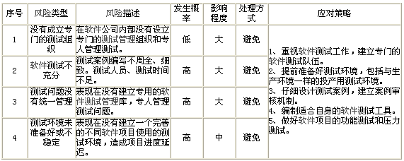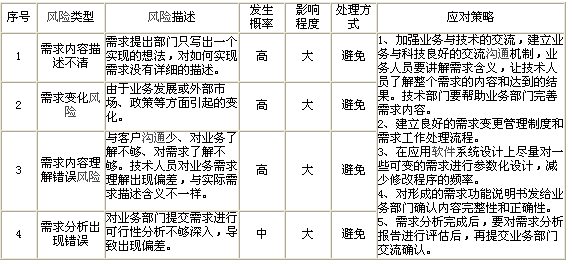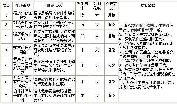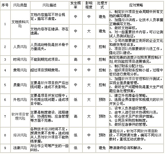 6、其他方面风险:主要包括文档资料风险、人员风险、培训风险、项目管理风险、外包风险及法律风险。