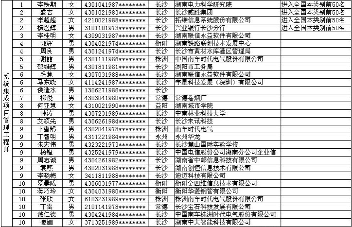 湖南省2012年上半年系统集成项目管理工程师前10名名单