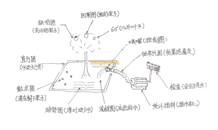 好家伙记忆内容有十几个,一下很难记住,关键是要找到一条合理的线索,我发现越复杂的问题采用场景记忆就越容易。2011年下半年作文考的就是这个质量管理工具,哈哈,本人采用的是一幅《果树浇水》的场景记忆,照单全收,真是一个都没忘啊。