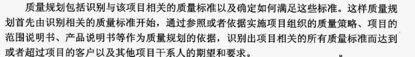 所以说,质量计划是项目质量管理的计划过程,质量控制是项目质量管理的管理过程,质量保证是项目质量管理的审核过程。三者有机组合形成项目质量管理的全阶段。