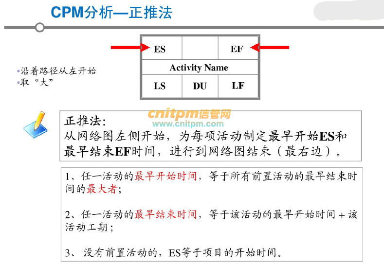 2)最早结束时间(EF):某项活动能够完成的最早时间。EF=ES+工期估算