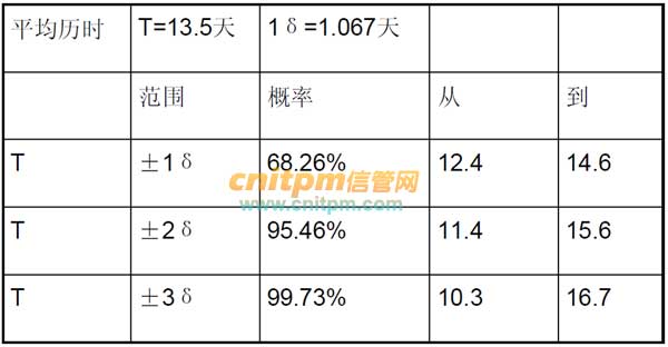 在一个标准差也就是12.4天到14.5天内完成的概率是68.26%,所以在一个标准差的一半时间,也就是13.5到14.5天内完成的概率是34.13%
