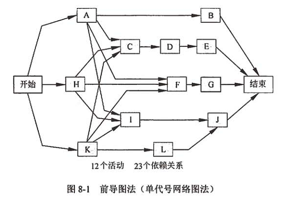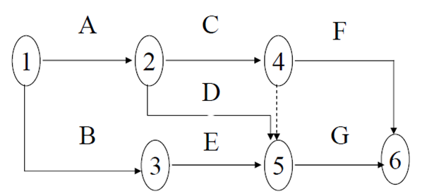 箭线图法(Arrow Diagramming Method,ADM)是用箭线表示活动、节点表示事件的一种网络圈绘制方法,这种方法又叫作双代号网络图法(Active Onthe AITOW,AOA),如图8-4所示。在箭线表示法中,给每个事件而不是每项活动指定一个唯一的代号。活动的开始(箭尾)事件叫做该活动的紧前事件(precede event),活动的结束(箭头)事件叫该活动的紧随事件( successor event)。 如下示意图