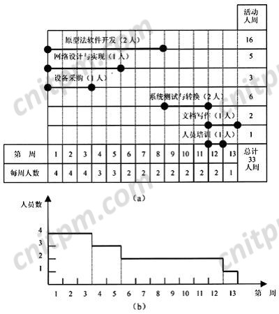 从图3(a)中可以看出,开发学籍信息系统项目总共需要13周,总工作量为33人周;从图3(b)中可以看出,前三周需要4个开发人员,第4、5周需要3个开发人员,第6至12周只需要2个开发人员,第13周需要一个开发人员。显然,该项目的人力需求波动较大。为了使人力资源尽可能地平衡,我们考察该项目的网络图,从图2中可以看出,该项目的关键路径是原型法软件开发、系统测试与转换以及文档写作三项活动,其他活动都处于非关键路径上。因此我们可以将设备采购活动推迟在第6周开始,这样就得到调整后的人力资源分配图(图4)。 图4 基于资源平衡的人力计划图