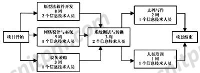 下面举例说明人力资源计划平衡的方法。假设有一个学籍信息管理系统已经立项,由于系统较小,准备采用原型法开发,并拟定了一个带有各子活动工期和人力需求的网络图(图2)。我们假设参加这个项目的所有成员都是多面手,也就是说,项目成员之间是可以相互替代的。