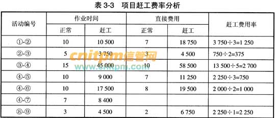 第二步:根据题目信息比较正常的时间和赶工的时间,以及正常费用和赶工费用,同时计算出赶工费用率,如表3-2所示。