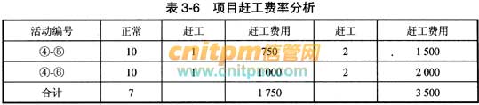 ④-⑦是不可调整的,④一⑥赶工时间为8,因此,最多可赶工2天,如表3-6所示。