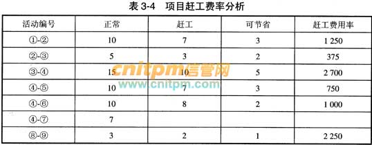 假定比较其他电子商务平台的任务执行需要13天而不是原来估算的10天。那么,由于①-②比较其他电子商务平台位于关键路径上,因此,将导致整个工期延长3天,为此,小张必须考虑赶工来保证项目按进度完成。赶工原则是“采用优先考虑赶工费用率最低的工作”。根据表3-3推导出表3-4.
