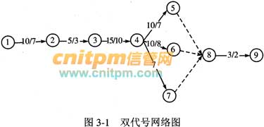 第三步:根据活动编号画出该项目的双代号网络图,如图3-1所示。