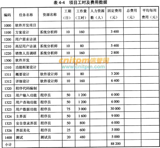 项目正式立项后,李工制定了一份初步的项目成本计划。李工估计出了每项工作的工期及所需要的工作量,如表4-4所示。此外,表4-4也给出了每项工作除人力资源费用外的其他固定费用(如硬件设备和网络设备等)。