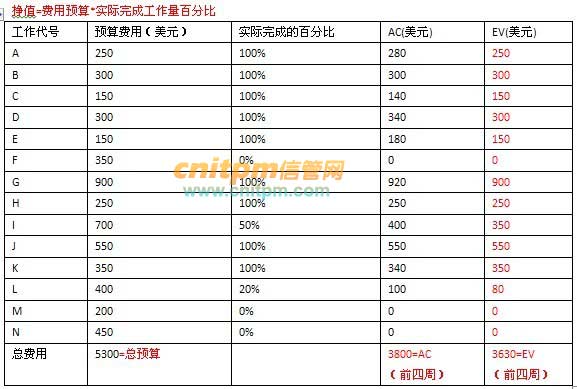 计算前4周各项工作的挣值,并计算出项目在第四周末的挣值,填入表中。