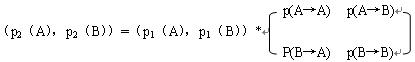 设本月品牌A和B的市场占有率为P1=(p1(A),p1(B)),则下月这两个品牌的市场占有率P2为简单地可以描述为:P2=P1*P,其中P就是当月到下月这两种品牌市场占有率的转移矩阵。