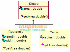 如图1所示,Rectangle和Circle都继承于Shape,对于Shape而言,会有getArea0的操作。但显而易见,Rectangl和Circle的getArea()方法的实现是完全不一样的,这就体现了多态的特征。