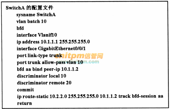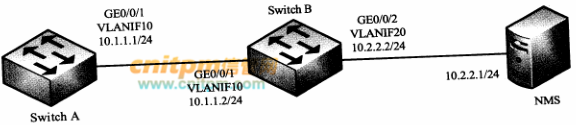 57、 如图所示,Switch A通过Switch B和NMS跨网段相连并正常通信。SwitchA 与Switch B配置相似,从给出的Switch A的配置文件可知该配置实现的是( 1 ),验证配置结果的命令是( 2 )。