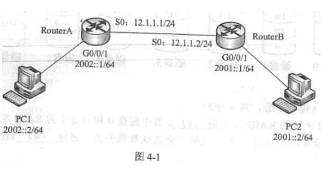 公司的两个分支机构各有1台采用IPv6的主机,计划采用IPv6-over-IPv4自动隧道技术实现两个分支机构的IPv6主机通信,其网络拓扑结构如图4-1所示。