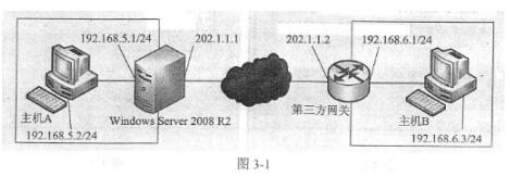 如图3-1所示在Windows Server 2008 R2网关上设置相应的IPSec策略,在Windows Server 2008 R2网关和第三方网关之间建立一条IPSec隧道,使得主机A和主机B之间建立起安全的通信通道。