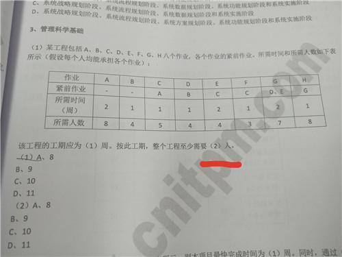 工期就是画图,画对就出来了,算人数我建议不行就用答案往里带吧,先看8人,发现A执行完到C剩余3人,其他都做不了,等C完事,做B E 在做D,人手不够了,没发做F,排除掉,以此类推算还能快点