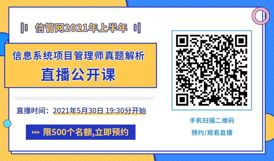 2021年上半年信息系统项目管理师考试将于5月29日开考,考试结束后5月30日晚上19:30分,JRS直播资深老师将专业解析2021年上半年信息系统项目管理师真题,欢迎各位考生免费预约观看。